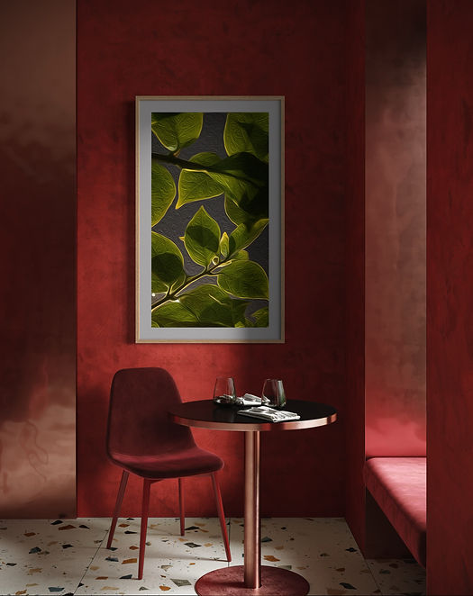Crowd green leaves on the Urban street trees, under dim lighting at night, as if they are chattering. The bold color combination, lively composition, create an eye-catching piece of art.
