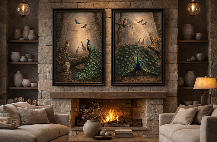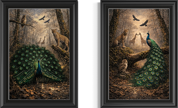 In The Enchanted Wilderness, the quiet majesty of the natural world unfolds within a luminous woodland setting where wildlife appears as both observer and guardian. At the centre of the composition, the peacock-long regarded as a symbol of beauty, dignity, and renewal-commands the forest with calm authority, it's iridescent feathers unfolding like a living tapestry of color and light.