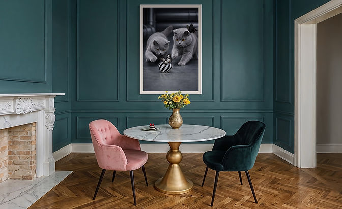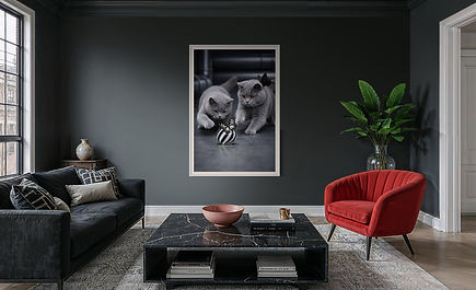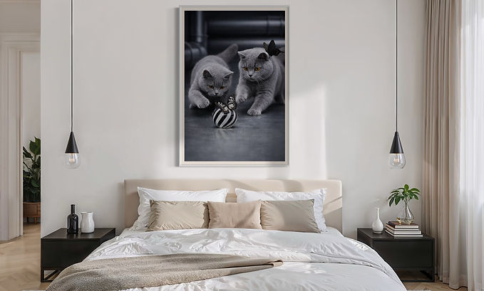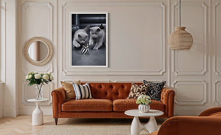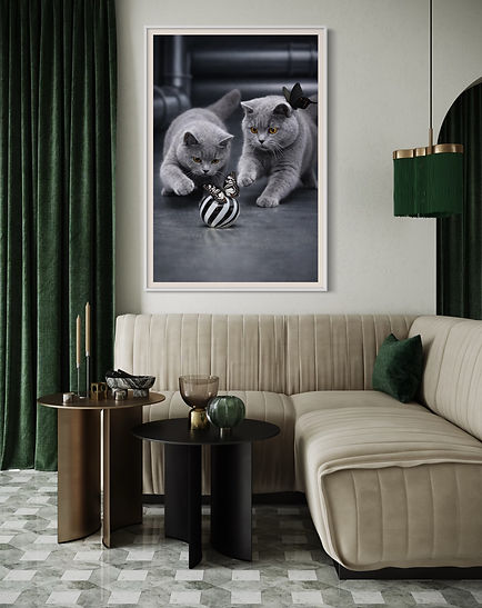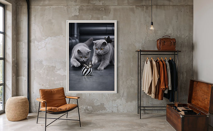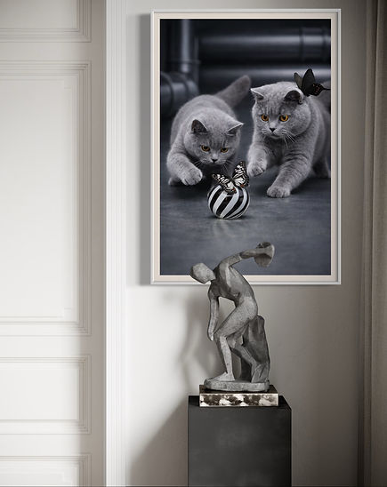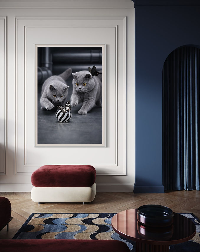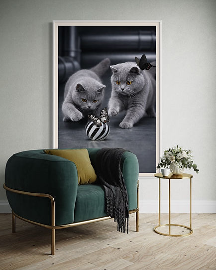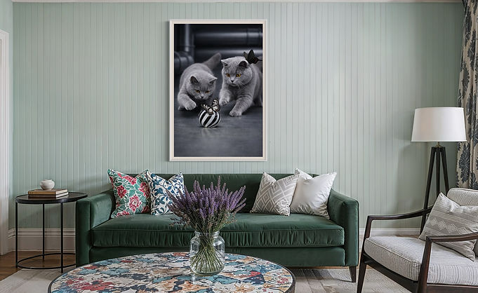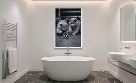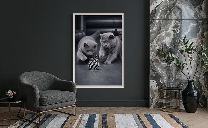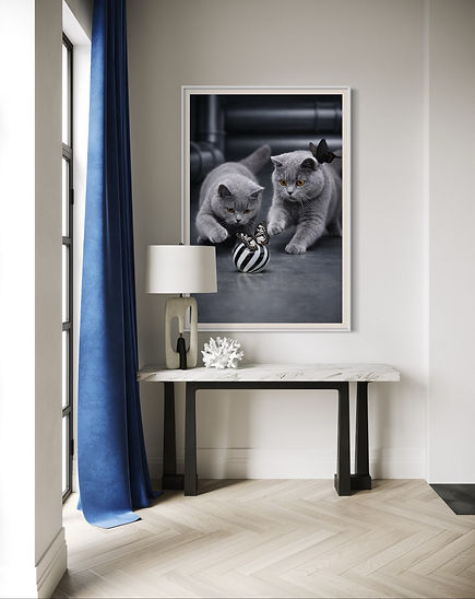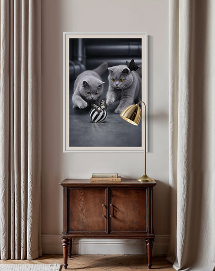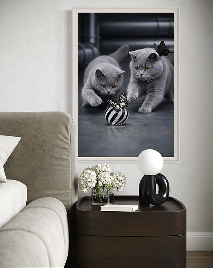 This striking art captures a moment of playful curiosity frozen in time. Modern yet tender, this piece celebrates curiosity, companionship and the quiet intensity of feline focus. The artwork blends realism with artistic styling, bringing a movement, elegance, and refined charm to the space.