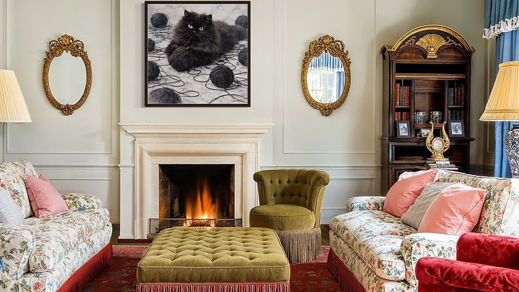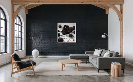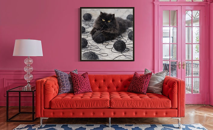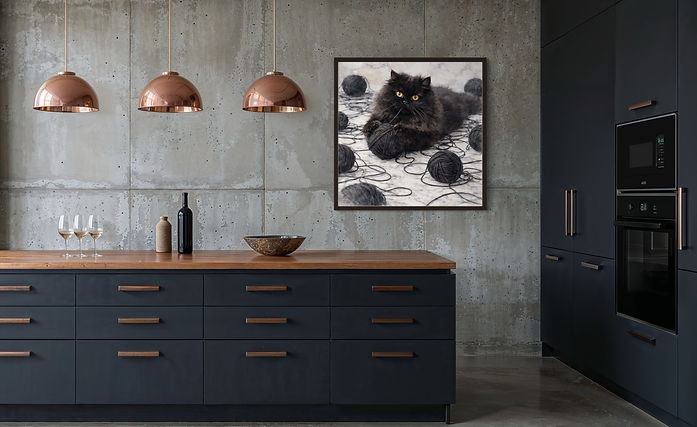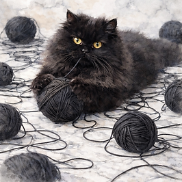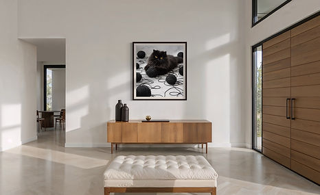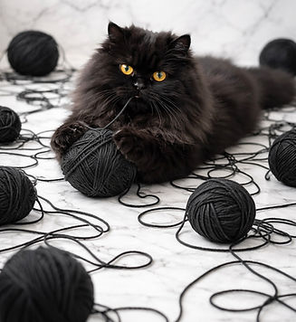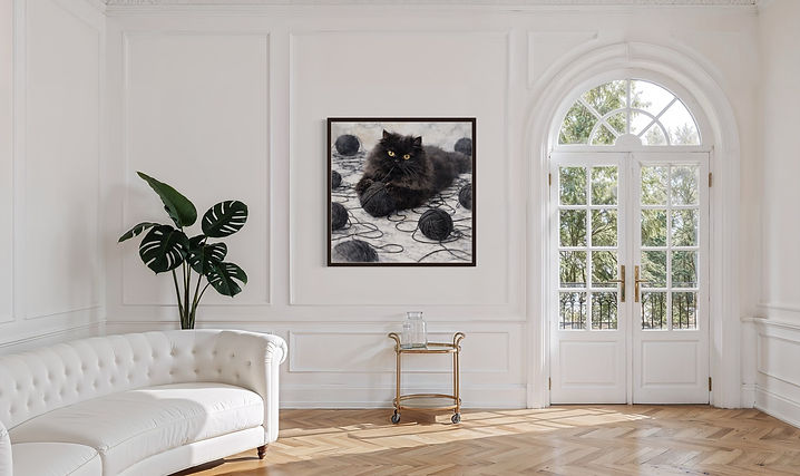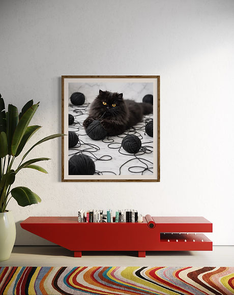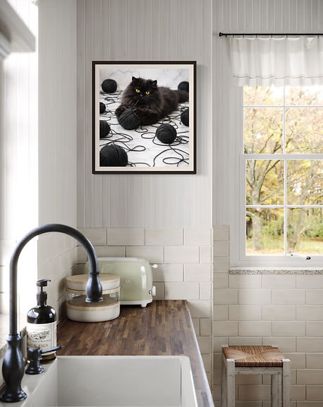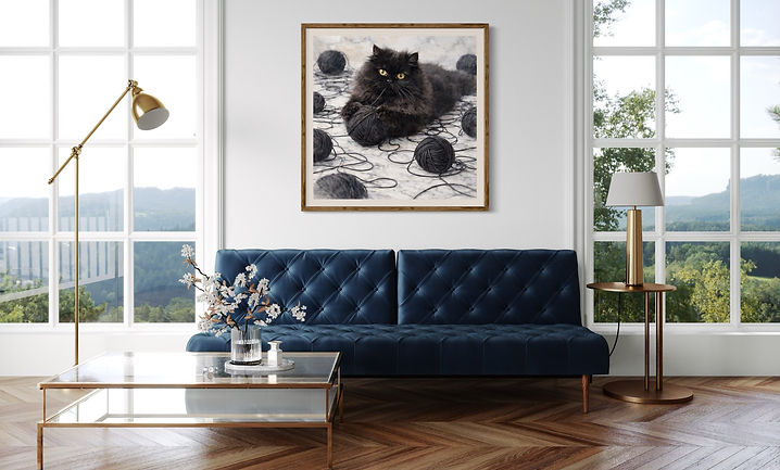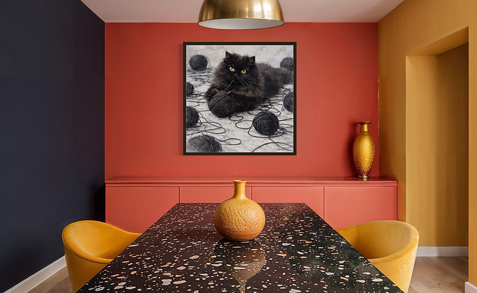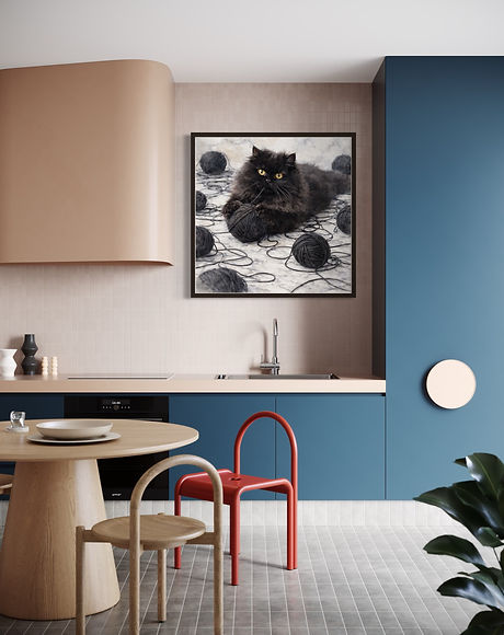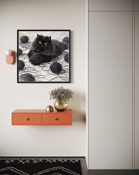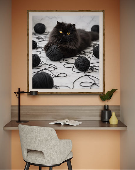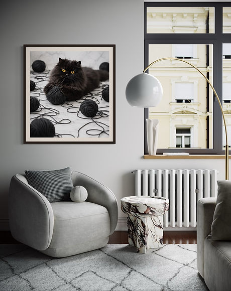 "Cat and the black yarn ball" feels both lifelike and artistic. The monochromatic palette-deep charcoal against soft stone tones-adds sophistication and a modern edge to the piece, which is perfect for modern interiors, cozy reading corners, or creative spaces. "Cat and the black yarn ball" blends elegance with whimsy, bringing personality, texture, and a touch of dramatic charm to any space.