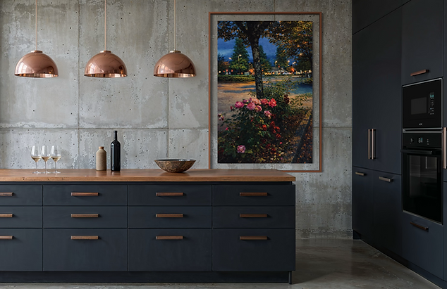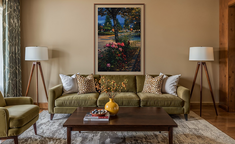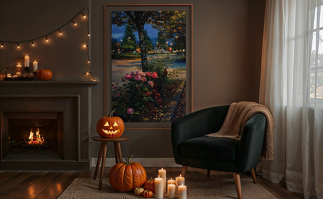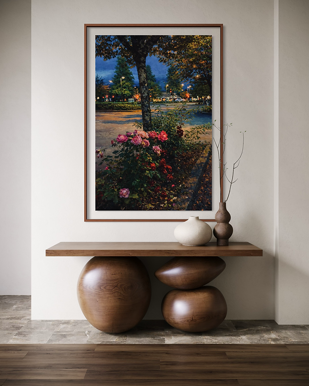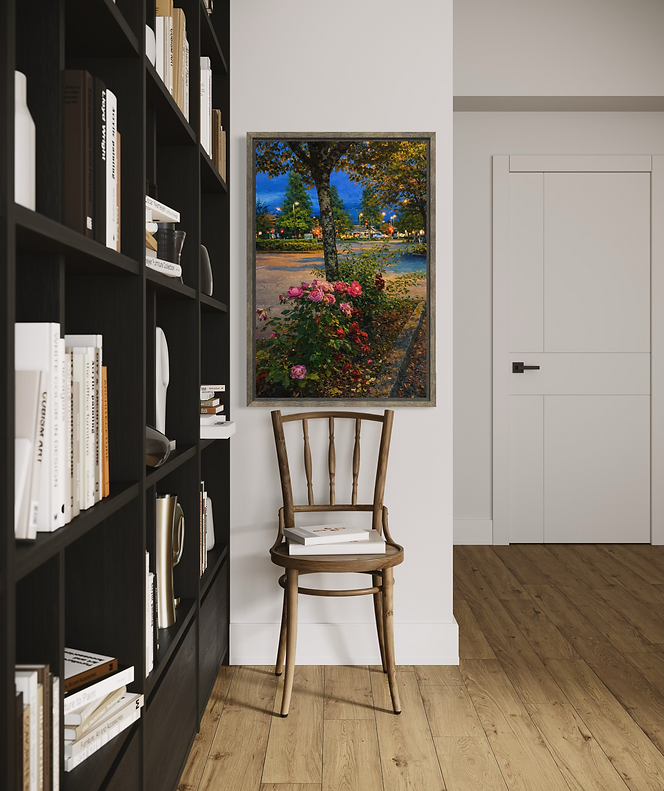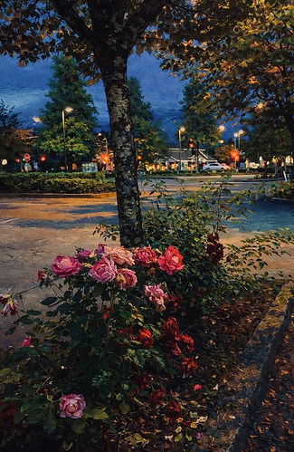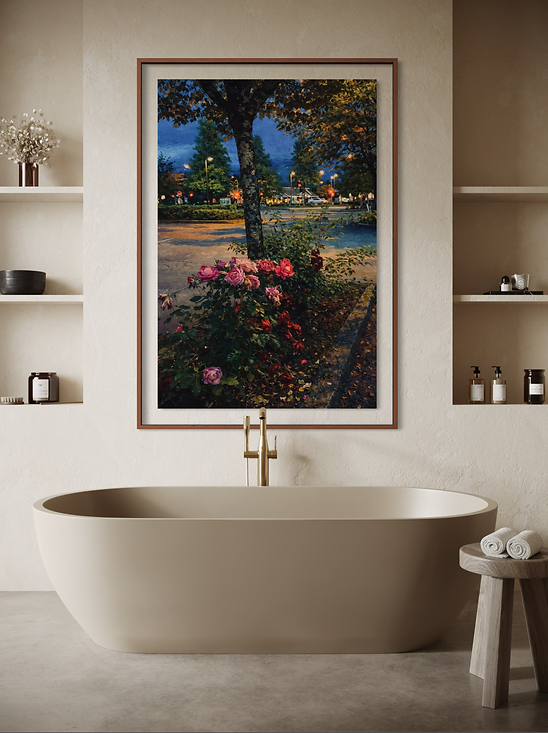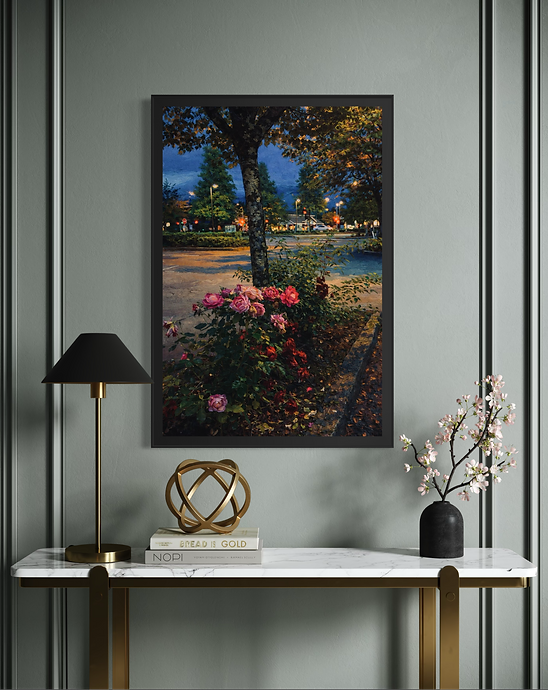 A romantic twilight scene where glowing roses bloom beneath a city tree, illuminated by the soft poetry of evening light. Rich textures and luminous colours evokes calm, nostalgia, and timeless beauty.