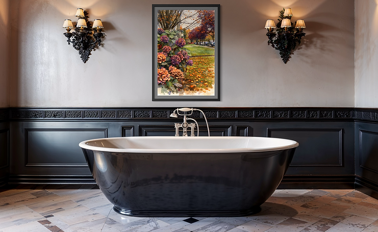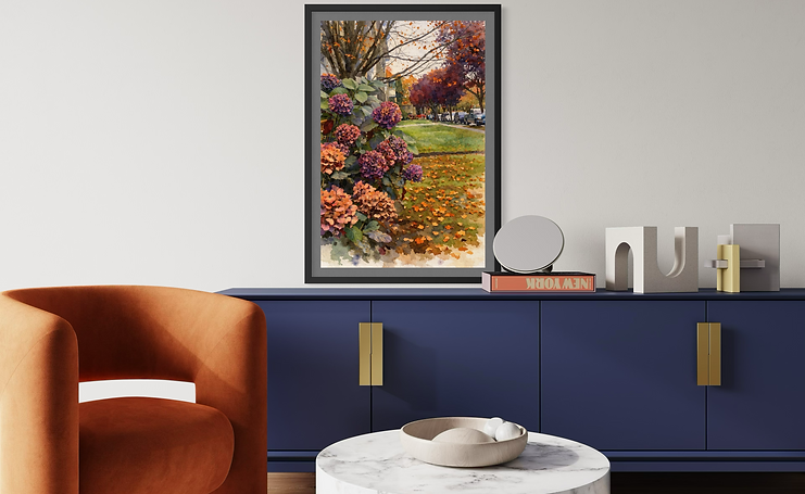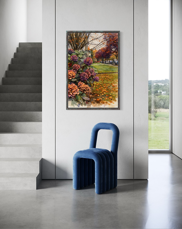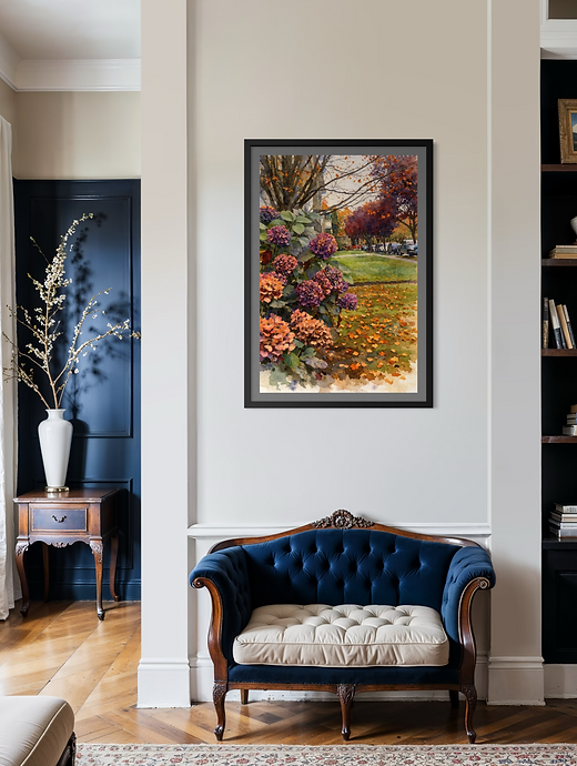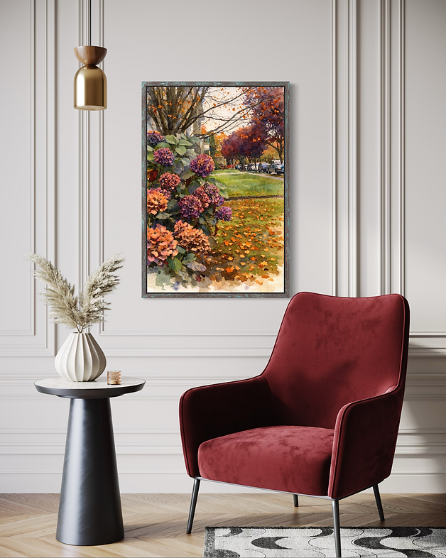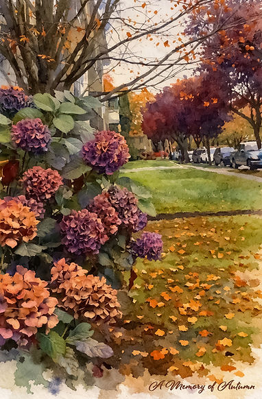 " A memory of Autumn" captures the intimate poetry of a peaceful neighbourhood as the season gently shifts towards its golden finale. In the foreground,lush hydrangea blossoms unfold in rich tones of plum, mauve, and faded rose, their petals softenedd by the cool air of late autumn. Fallen leaves scatter across the grass like fragments of memory, forming a warm tapestry of amber, ochre, and burnt Sienna. Rendered in a painterly style reminiscent of impressionist realism, the artwork balances detail and softness, creating both depth and softness.